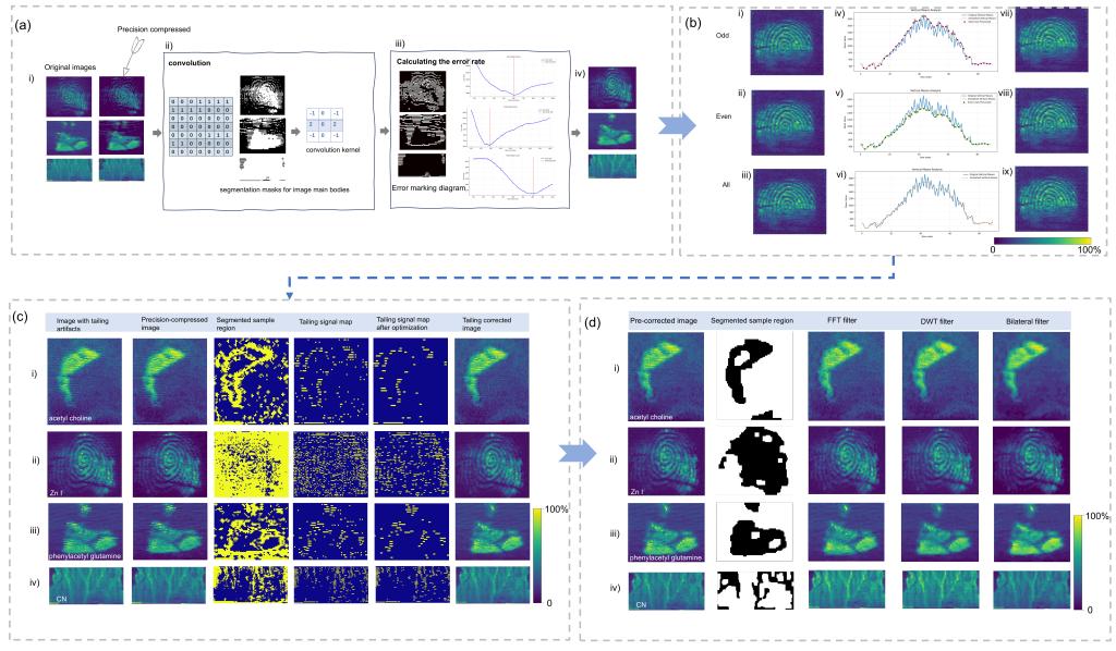 质谱成像(MSI)与光学发射光谱成像(OESI)作为免标记的化学成像技术,能够精准绘制生物及化学样品中分子与元素的空间分布图谱,在肿瘤分类诊断、单细胞代谢组学、神经科学等生物医学前沿领域展现出重要的科研价值与临床应用潜力。然而,上述技术在实际应用中常面临像素错位、条纹缺损、拖尾效应及环境噪声干扰等问题,严重影响图像质量和后续数据解读的准确性。现有解决方案多依赖于硬件升级或人工筛选,不仅成本高昂,也难以实现规模化推广。