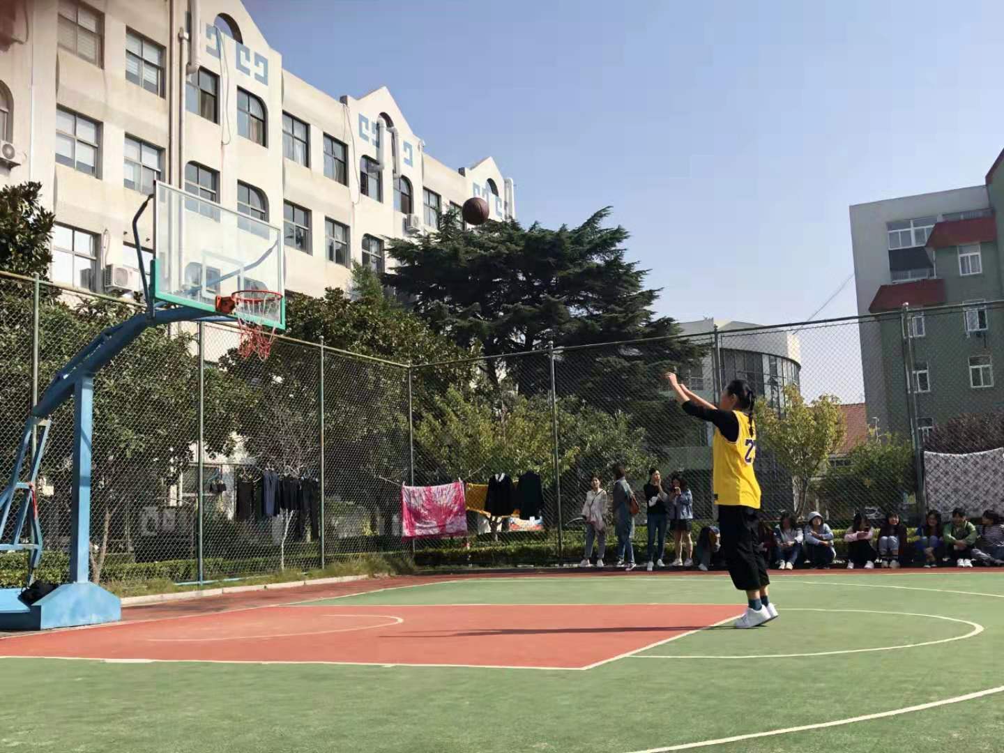 接下来女生们进行了定点投篮,每人五个球,由两个记分员分别记录进球数,大家相互鼓励指导,最后,研究生一年级的刘欣夺得第一名。比赛过程中裁判员公平公正,客观吹罚,保障了比赛的顺利进行。
