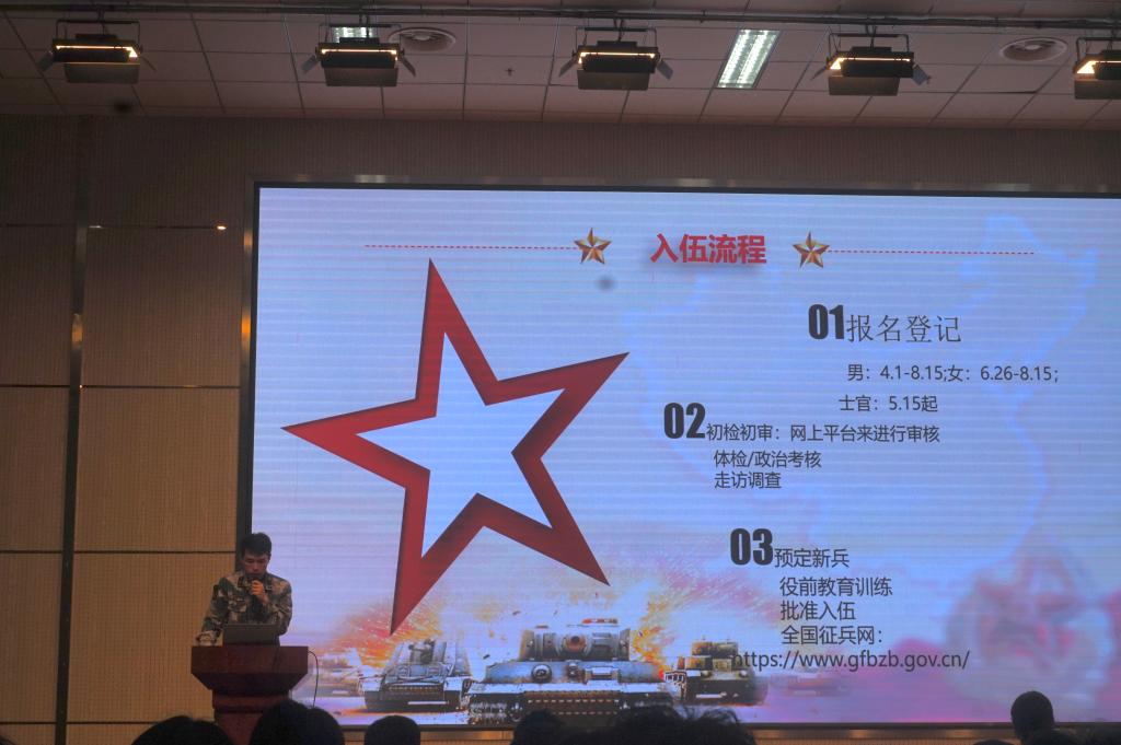 接下来,郁一帆从部队简介、应征入伍基本条件和入伍流程三个方面系统全面地向大家介绍了入伍基本概况,并对大学生参军特别优惠政策进行了详细的解读。最后,他号召同学们要珍惜携笔从戎的机会,把握机遇,切实把参军入伍当作锻炼自己、提升自己的大舞台,让青春在军营的历练中、在保家卫国的奉献中闪光!