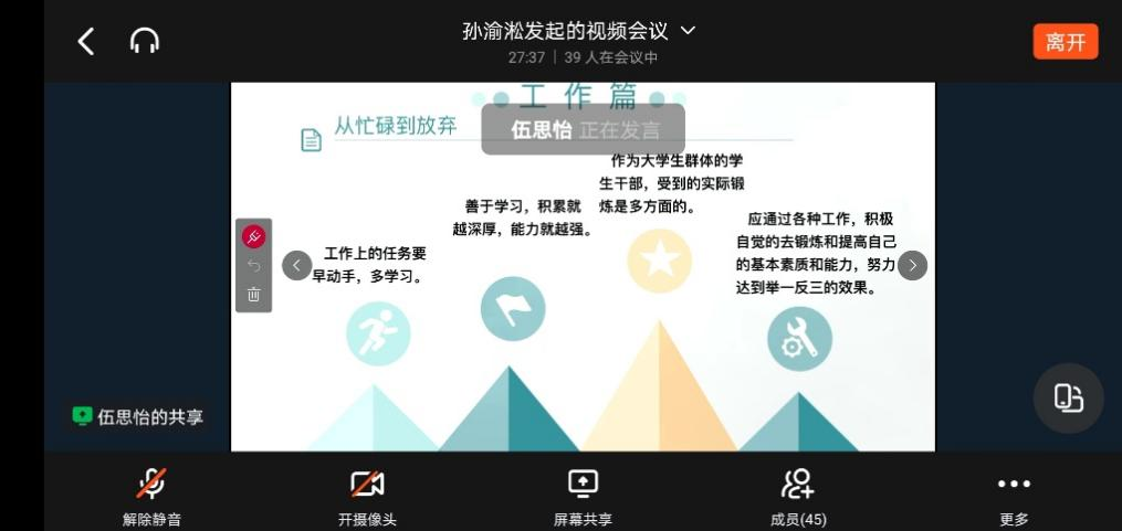 “十佳”优秀学生伍思怡通过钉钉直播方式为近五十名2019、2020级本科大学生骨干进行了题为“如何做一名优秀学生干部”的线上培训。