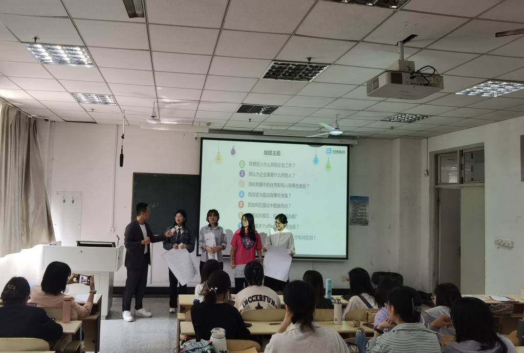 在短暂的课间休息后,田新宇将全体同学分为八组,进行“主题咖啡”环节。该环节由各组分别对“我想进入什么样的企业工作?”“我认为企业需要什么样的人?”“我和我眼中的优秀职场人有哪些差距?”“我应该为面试做哪些准备?”“我如何在面试中脱颖而出?我面试失败后,应该如何去做?”“我手里多个offer时,如何选择?”“我认为考公考编与进入企业工作有何区别?”这八个问题进行讨论,并由小组代表汇报发言。王倩倩与田新宇对各位组长的汇报进行点评,并结合企业实际情况进行补充分享。
