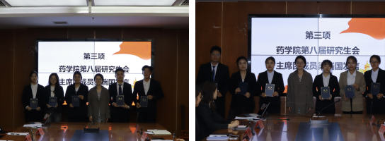 第七届研究生会主席团成员梁瑞国宣读第八届研究生会主席团名单及各部门负责人、工作人员名单,由辅导员仇启荣为研会成员颁发聘书。