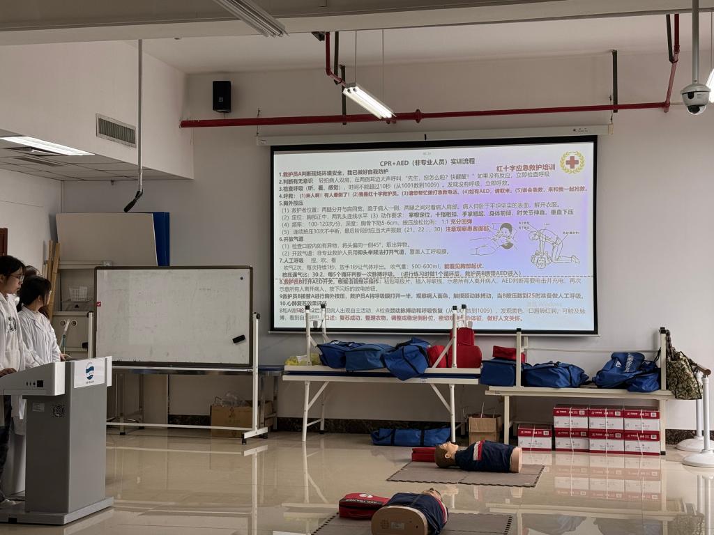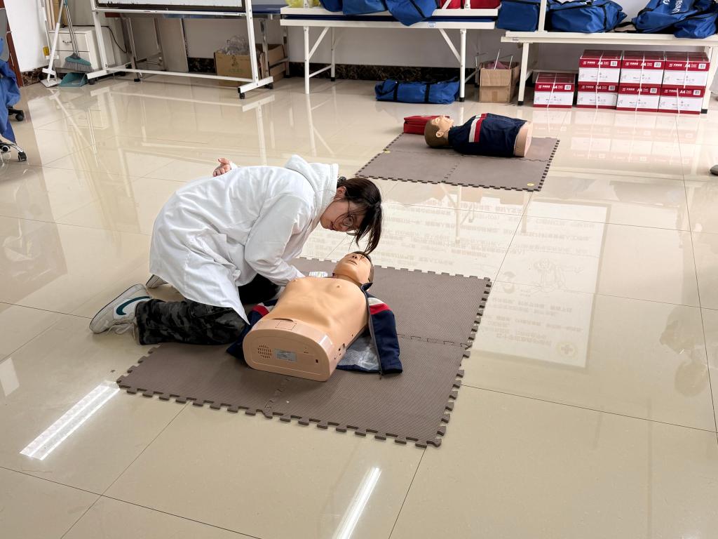 最后,参训同学依次在模拟人上进行实操练习。在专业指导下,大家及时调整姿势、精准把控按压节奏,通过反复练习巩固技能,真正实现从理论到实践的转化,做到听得懂、学得会、用得上。"第一次按压时手有点抖,但在培训人员的指导下很快就找到了感觉。"一位参训同学分享道。现场气氛活跃,同学们相互鼓励、相互学习,在实践中不断提升操作熟练度。培训人员穿梭于各个练习点,一对一指导及时纠正不规范动作,确保每位同学都能掌握正确的操作方法。