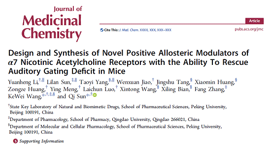 王克威教授与北京大学孙崎副教授合作,在药物化学领域权威期刊《药物化学杂志》(Journal of Medicinal Chemistry)上在线发表了题为“The design and synthesis of novel positive allosteric modulators of α7 nicotinic acetylcholine receptors with the ability to rescue auditory gating deficit in mice”(DOI:10.1021/acs.jmedchem.7b01492)的研究论文。