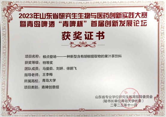 王克威教授团队的硕士研究生马曼茹、刘妍、徐鹏飞等同学组成参赛队伍参加比赛,指导教师为王李梅老师。本次参赛项目“椒点登场——一种新型含有胡椒提取物的果汁茶”获得专家评委的一致好评,荣获青啤创意组“特等奖”。“椒点”创意立足“更健康,更新颖,更潮流”的理念,对年轻人对饮料的消费趋势展开广泛问卷调查,该团队根据问卷调查的结果以及社会饮料市场的消费趋势,设计了具有降脂功效的果汁茶功能饮料。“椒点”不仅与当下“无糖、健康”的饮料消费趋势相吻合,且口味丰富多元,具有降脂功效,真正做到了“更健康,更新颖,更潮流”。下一步,团队将继续提升研究生创新与实践能力培育,推动创意成果的转化。