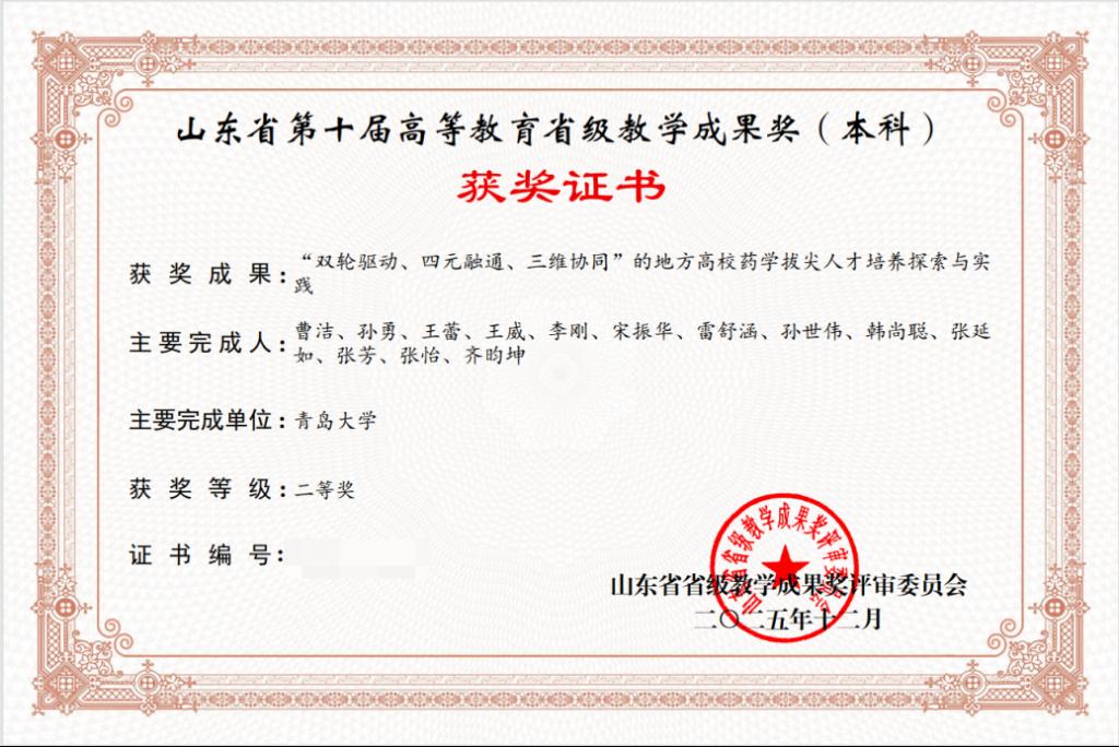 曹洁教授组织申报的《“双轮驱动、四元融通、三维协同”的地方高校药学拔尖人才培养探索与实践》荣获二等奖。这是台湾a片