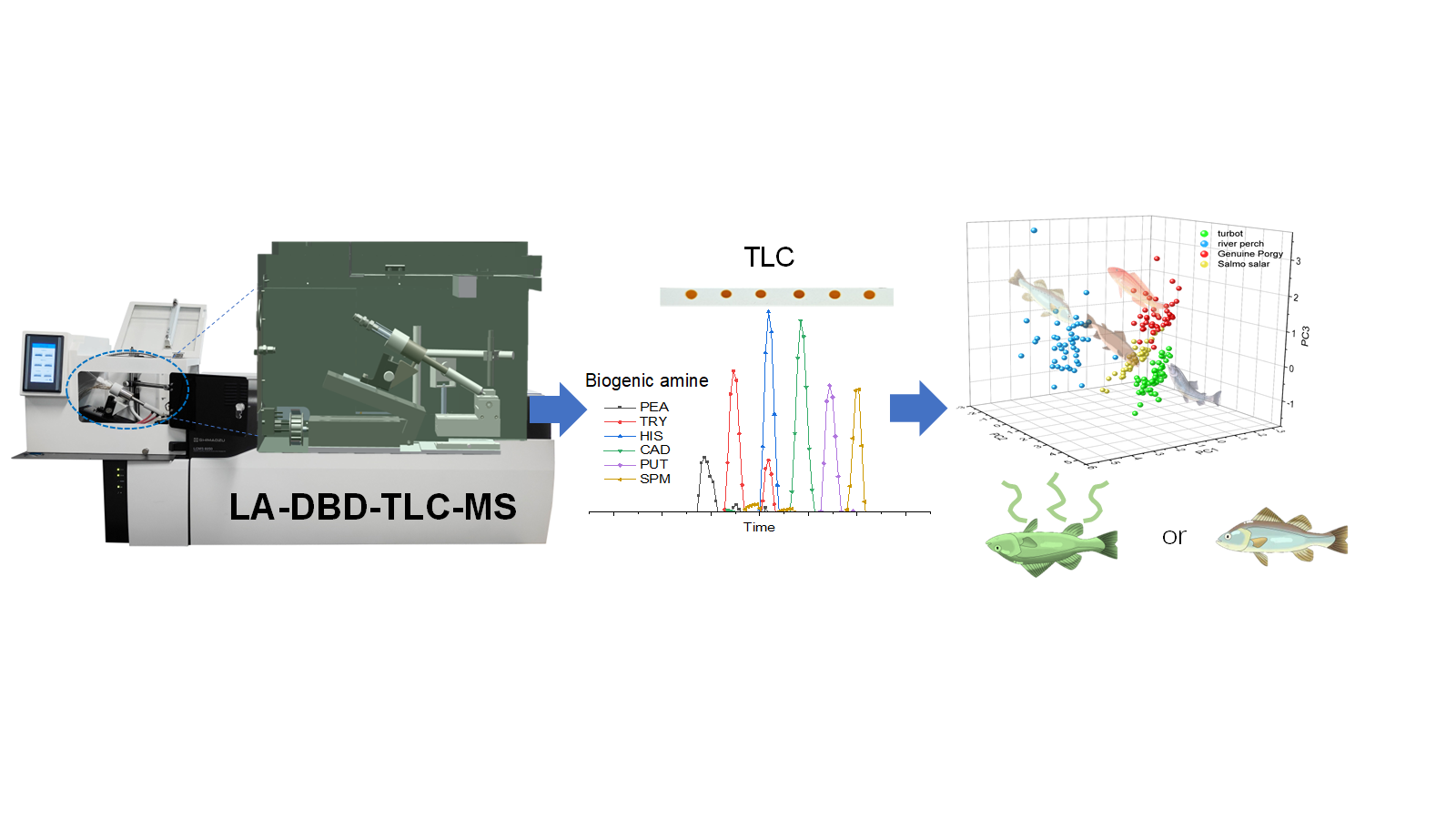 丁薛璐、梁帅团队研制了一款新型、紧凑、全自动激光烧蚀介质阻挡放电薄层色谱-质谱检测装置(LA-DBD-TLC-MS)(图1)。通过正交实验设计和气流仿真模拟,优化了包括放电条件、等离子体光束方向、激光输出和基体材料浓度在内的关键参数,成功将该仪器应用于水产品中致毒BAs的快速检测,其定量分析结果与HPLC-MS/MS相当。同时,结合机器学习算法对鱼类进行物种识别和腐败评估。研究发现,富含氨基酸和咪唑的深海鱼在变质时更容易产生BAs,尤其是组胺和酪胺。这些胺类物质可以作为监测渔业产品质量和安全的关键标志物。此外,利用PCA、RF、SVM、MLP和MLR等机器学习算法对量化后的BAs数据进行物种区分和腐败时间评估,测试集准确度高于96%。