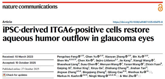我院朱玮教授课题组2024届博士生封鹏超和张晓燕同学在《Nature communications》上发表了攻读博士期间的第1篇研究论文,论文题目为“iPSC-derived ITGA6-positive cells restore aqueous humor outflow in glaucoma eyes”(DOI:)。我院封鹏超和张晓燕、美国杜克大学Chen Yu博士、中国海洋大学徐彬副教授和首都医科大学附属北京同仁医院武珅助理研究员为本文的第一作者。朱玮教授、青岛大学再生医学与检验创新研究院院长徐文华教授、首都医科大学附属北京同仁医院王宁利教授为本文通讯作者。我院为第一单位和通讯单位。