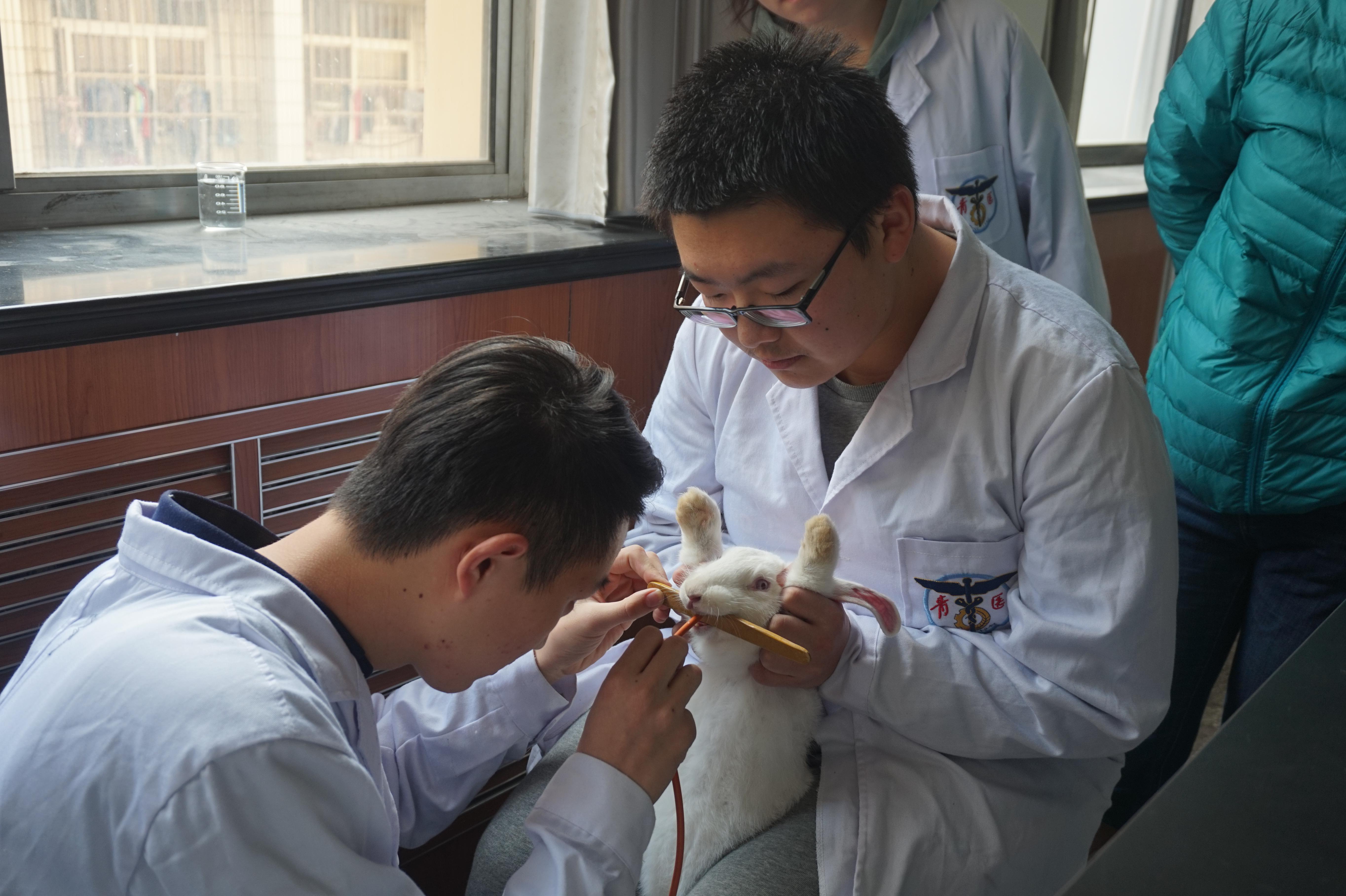 复赛形式为实验操作,考察学生药理实验、药物化学实验和仪器分析实验的实操技能。药理实验是小鼠的腹腔注射,家兔的耳缘静脉注射和灌胃;药物化学实验为酸碱滴定法计算氢氧化钠溶液中氢氧化钠的含量;仪器分析实验为紫外分光光度法测定异烟肼水溶液中的异烟肼含量实验。指导老师根据同学们现场的实验操作表现进行打分。