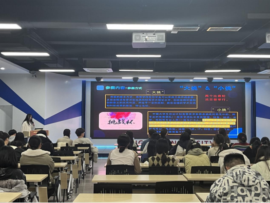 “挑战杯”大赛主讲人白皙同学介绍了“大挑”“小挑”的不同参赛内容、方式、区别以及奖项等级,详细讲述了赛程安排、竞赛奖励及推免政策,强调了大赛的优势与含金量,鼓励同学们积极参与比赛。