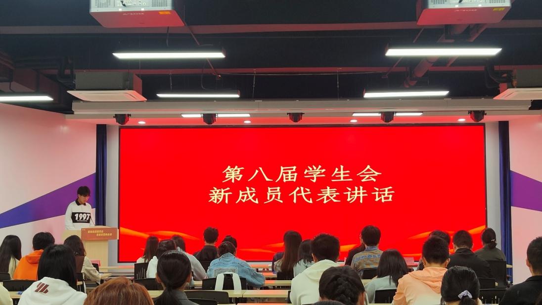 第八届学生会新成员陈玮玉同学上台发言。“从对加入学生会的憧憬到真正成为学生会大家族的一份子;从初始的迷茫到初步了解工作指南以及全心全意为同学服务的观念,我们新成员要走的路还有很长……”陈玮玉如是说道。他表示,只有在夯实专业基础的前提下,接受批评,敢于拼搏,不断学习和掌握新知识新技能,才能更好地借助学生会的平台,服务同学、展示自我。