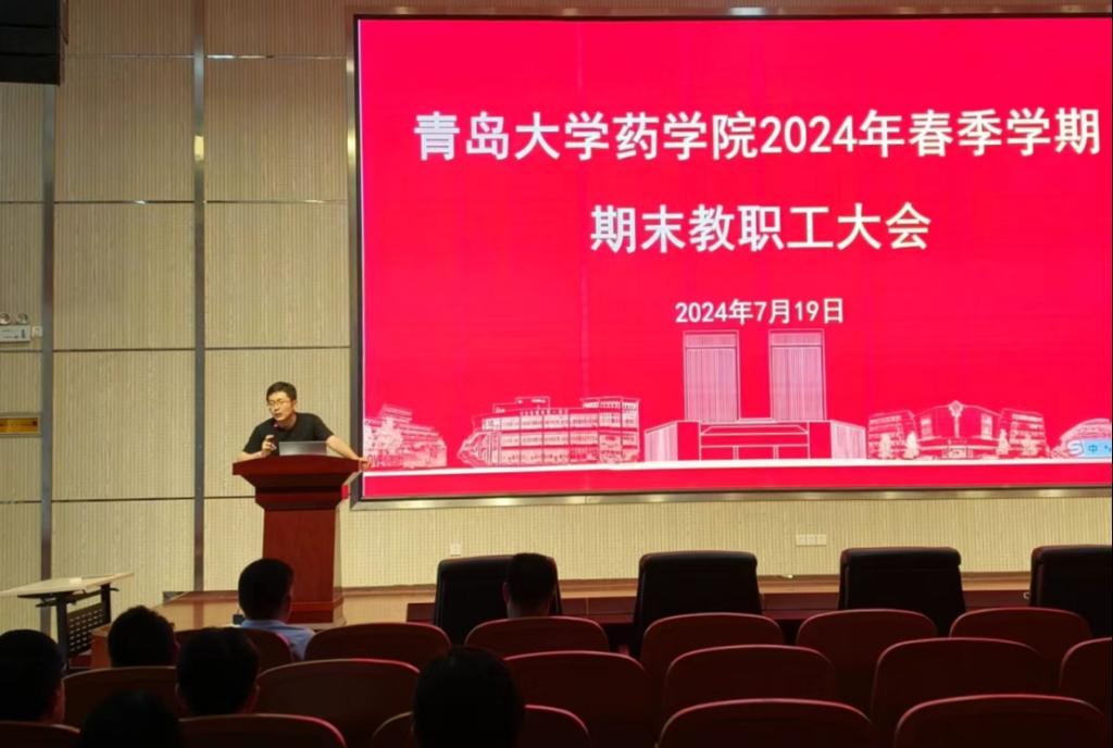 院长孙勇作总结发言,对全体教职工的辛勤工作表示感谢,并指出学院今后的工作重点是学科建设和学院创收。他强调,在本科生人才培养方面,要对培养方案、课程设置进行优化,全面提高教师授课质量,加大对大学生创新创业等竞赛的指导;在研究生培养方面,要坚持特色,强化研究生组会制度,加强对研究生学位论文写作的指导;在科研成果方面,要加强国家级省级平台建设,加大对科技奖励、重点科研项目、高层次科研人才称号的培育,争取在获取新药批件上实现新突破。