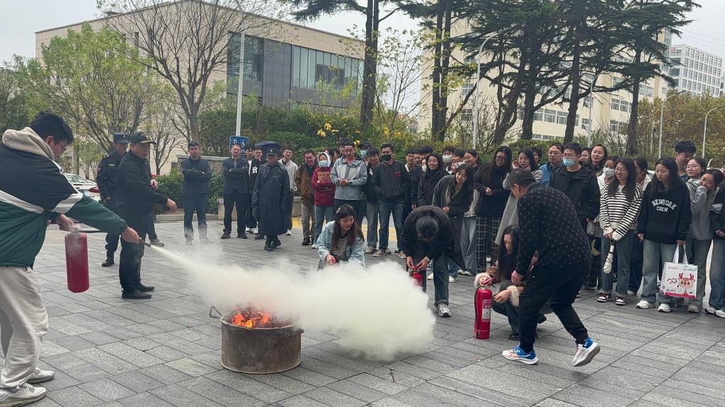 周伟、王洪运及孙勇分别做了动员讲话和发言。崂山区消防救援局应急救援大队刘小楠主任详细介绍了消防工作方针和原则,每个人应该具备的消防安全的四个能力,专门指出高校实验室消防安全特点和总体要求,同时为广大师生普及了消防安全小知识包括消防标志、火灾报警、火灾扑救、人员疏散、紧急救援等多个环节。最后演示灭火器及水带的使用方法。上午10时,防空警报拉响,烟幕弹冒气白烟,正式开始消防演练,模拟了发生火灾时的紧急情况,全体师生在消防人员的疏导下,迅速按照应急预案进行逃生训练。演练过程中,消防员为大家详细讲解了灭火器的使用方法,并分组让师生们实际进行了灭火器灭火训练,取得了良好效果。