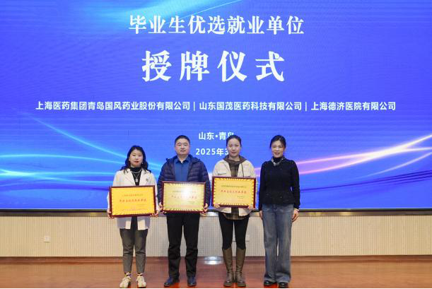 为鲁南制药集团颁发“产教深度融合示范单位”荣誉牌匾,为上海医药集团青岛国风药业股份有限公司、山东国茂医药科技有限公司、上海德济医院有限公司颁发“毕业生优选就业单位”荣誉牌匾,表彰其对校企协同育人的突出贡献。