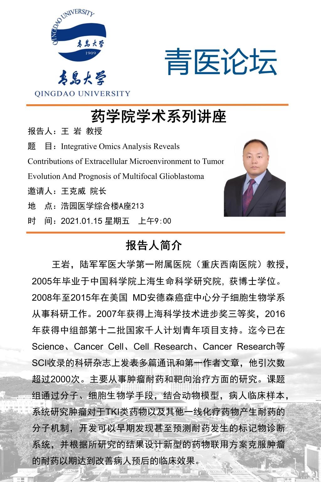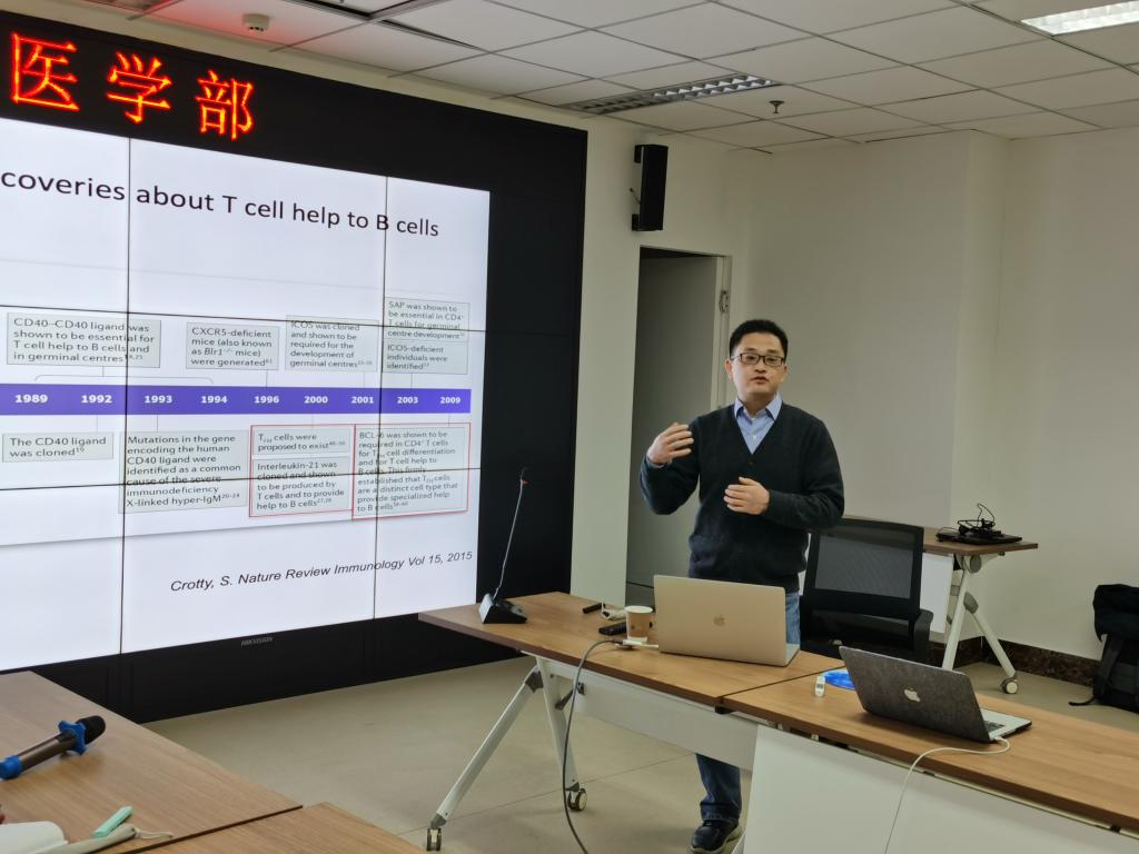 1月15日上午,医学部台湾a片 邀请陆军军医大学王岩教授和刘新东教授分别作了题为《Integrative Omics Analysis Reveals Contributions of Extracellular Microenvironment to Tumor Evolution And Prognosis of Multifocal Glioblastoma》和《The Heterogeneity in Follicular helper T (Tfh) cells》的学术报告,报告在浩园医学综合楼A座213会议室举行,会议由王克威院长主持。