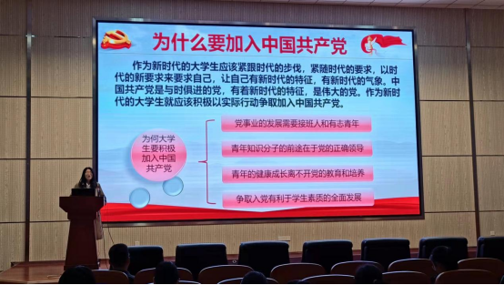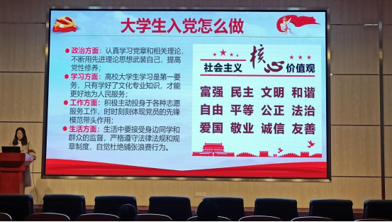 于浩园医学教育综合楼报告厅举办“让信仰点亮人生”新生入党启蒙教育活动。学生党支部组织委员王梦迪主讲,辅导员雷舒涵、2021级全体新生参加活动。