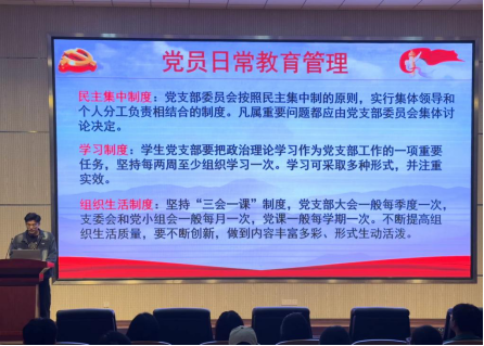 学生党支部的基本情况,包括各项规章制度、支部委员会的基本构成及其主要职责,以及主题党日活动的展示,让在场的同志们对支部有了更加全面和深入的了解。梁瑞国希望新生党员能够努力科研、勤奋工作,牢记党员身份,严格要求自己,在学院中发挥党员先锋作用,积极为学校和社会做出贡献。