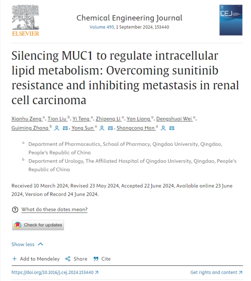 附属医院泌尿外科张桂铭主任医师合作,在肿瘤靶向基因药物递送研究方面取得新进展,相关研究成果以“Silencing MUC1 to Regulate Intracellular Lipid Metabolism: Overcoming Sunitinib Resistance and Inhibiting Metastasis in Renal Cell Carcinoma”为题发表在《Chemical Engineering Journal》(中科院期刊分区1区top期刊,IF=13.3)。该研究得到了国家自然科学基金委、山东省自然科学基金委等项目的资助。本文第一作者为台湾a片