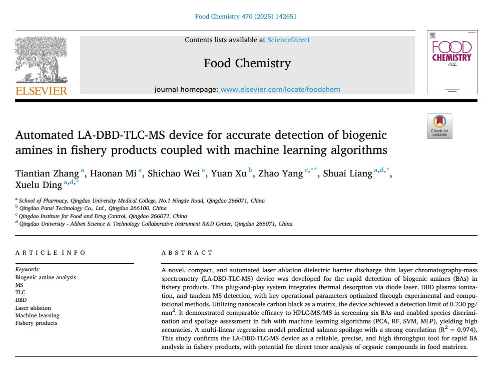 LA-DBD-TLC-MS采用全机械化触摸控制系统,能够提供精细的采样和检测程序,可最大限度地减少与手动操作相关的分析错误,为水产品中生物胺的定性和定量分析提供了一种易于操作且高效的方法。此仪器与方法分析时间短、灵敏度高,检测限和日间、日内重复性低,分析准确度高,对加强食品安全监测和阐明腐败机制具有广泛意义。未来将其整合到食品分析工作流程中,可以显著提高现场监测海鲜及其他食品质量和安全的能力。近日,该研究成果发表于食品化学领域顶刊《Food chemistry》(中科院1区top期刊,IF=8.5),题为Automated LA-DBD-TLC-MS device for accurate detection of biogenic amines in fishery products coupled with machine learning algorithms。台湾a片