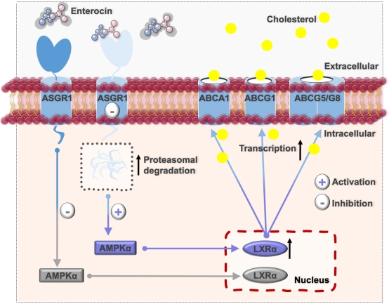 研究团队立足青岛特色海洋微生物资源,基于胆固醇外排活性筛选模型,发现一株海洋链霉菌Streptomycessp. FXY-T25粗提物具有显著活性。通过代谢组学分析、活性追踪、分离鉴定和作用机制等研究,明确活性成分为天然产物enterocin。本研究首次系统阐明了enterocin通过靶向肝脏特异性受体ASGR1发挥降脂作用的分子机制:enterocin直接与ASGR1结合,诱导其通过泛素-蛋白酶体途径降解,进而激活AMPKα-LXRα信号通路,上调胆固醇转运蛋白ABCA1/G1/G5/G8的表达,从而促进胆固醇外排并改善肝脏脂质代谢紊乱。