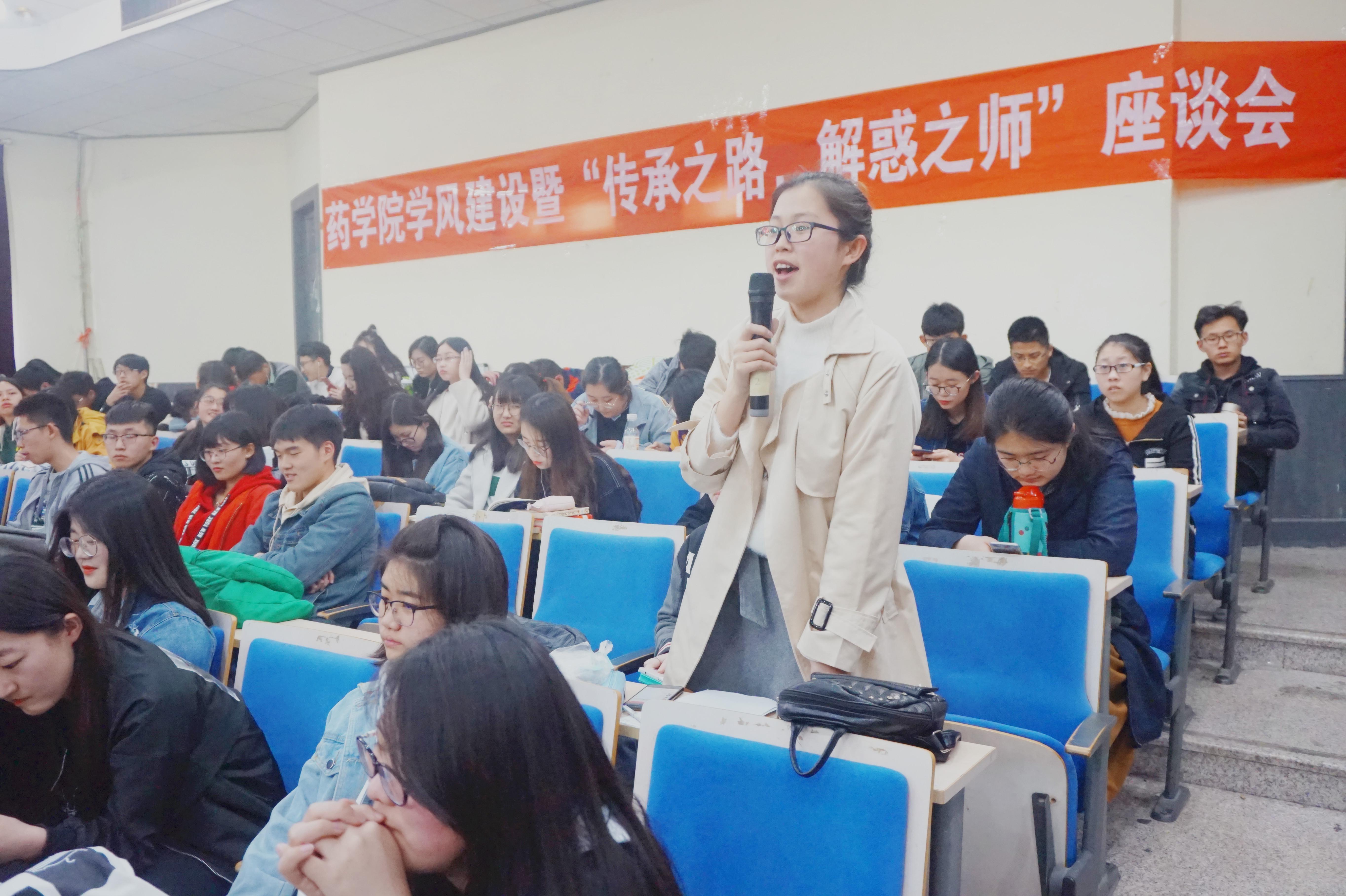 院长王克威,党委副书记李政,副院长孙勇,天然药物化学教研室主任王威,辅导员雷舒涵和一、二年级的全体本科生出席本次座谈会。