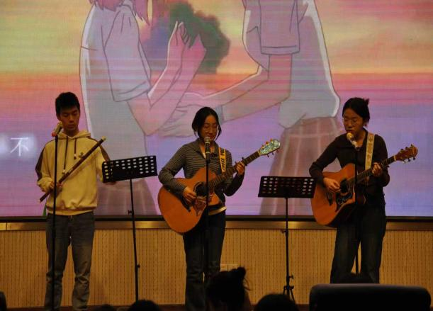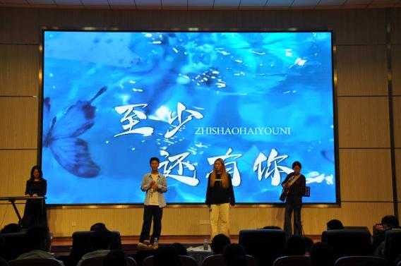 笑声过后,一首《青花瓷》,是葫芦丝等乐器与歌声的深情“对话”,迟佳雨、康鲁豫、马洪丽、刘佳坤为同学们展开水墨画般的合奏。意犹未尽之时,由刘奕柔带来的舞蹈《丽人行》翩然而来,柔美绰约的舞姿,完美再现了盛唐仕女的典雅风韵。随后是郑淋丹带来的琵琶独奏《草原小姐妹》,灵动而悠扬的琴声仿佛将同学们带到了辽阔壮美的草原。惊喜连连,“有奖竞答”环节再次袭来,大家已然蓄势待发,另一边问题难度也在“加码升级”,一攻一守间,晚会气氛毫无悬念地再次被推上了欢乐高潮。激情的抢答过后,一首《至少还有你》唱出了彼此陪伴的坚定与温暖。
