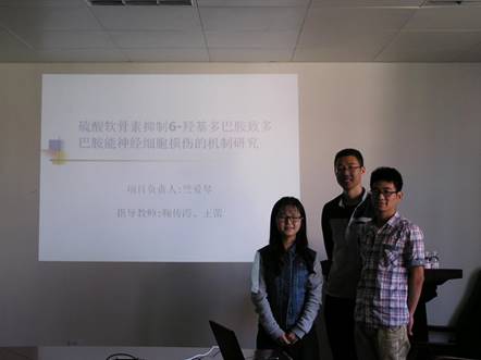 本次参加答辩的全是2013级本科药学班的同学,有竺爱琴同学负责的国家级项目《硫酸软骨素抑制6-羟基多巴胺能神经细胞损伤的机制研究》,杨九勇同学负责的校级项目《补肝散中香附配伍夏枯草不同提取物抗抑郁作用的研究》和葛峰同学负责的校级项目《穿虎痛风合剂质量标准再提高研究》。