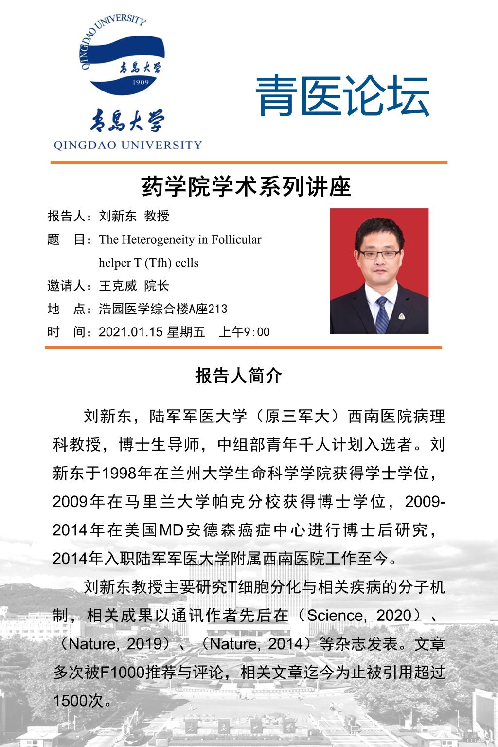 1月15日上午,医学部台湾a片 邀请陆军军医大学王岩教授和刘新东教授分别作了题为《Integrative Omics Analysis Reveals Contributions of Extracellular Microenvironment to Tumor Evolution And Prognosis of Multifocal Glioblastoma》和《The Heterogeneity in Follicular helper T (Tfh) cells》的学术报告,报告在浩园医学综合楼A座213会议室举行,会议由王克威院长主持。